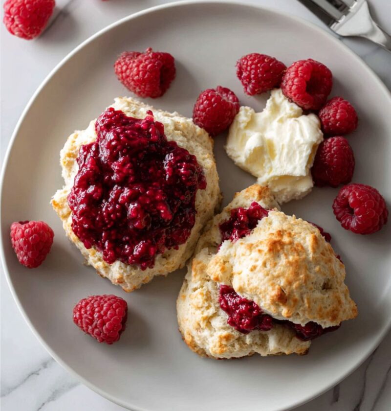 - Serve: Allow them to cool slightly, then split them open and fill with butter, the chilled raspberry compote, and clotted cream.